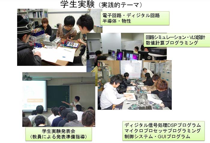 研究拠点大学でもあることから,各教員が推進する先端的研究に関係する研究課題を卒業研究として実施します.実際にデバイスを開発したり,新しい回路を設計したりします.3年生の秋に研究室配属をしますので,積極的に研究をしてみたい人は3年生の秋から先端的な研究をおこなえます.