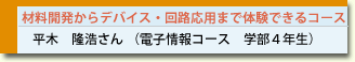 A. 高専では色素増感太陽電池に関する研究に取り組んでいたのですが、そのとき半導体材料やトランジスタなどの電子デバイスにも興味を持ちました。他の学科やコースも調べたのですが、将来は身近なエレクトロニクスへの応用に繋がる研究や仕事がしたいと思ったので情報エレクトロニクス学科を選択し、中でも電子材料からデバイス、回路まで扱っている電子情報コースが最適だと思いました。