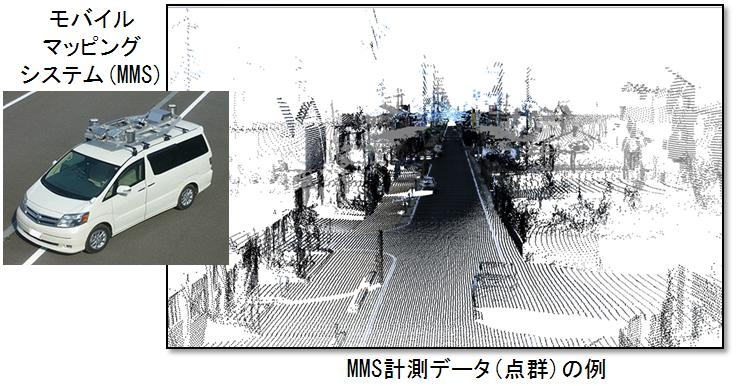 - 近年,実世界の物体の形状を非接触でレーザにより計測する技術が進んできています.中でも,自動車にレーザ計測器を搭載し,道路を走りながら計測することで,道路そのものの形状やトンネル,橋,道路周辺の電柱,建物などの形状情報を取得するモバイルマッピングシステム(MMS)が注目を浴びてきています.
