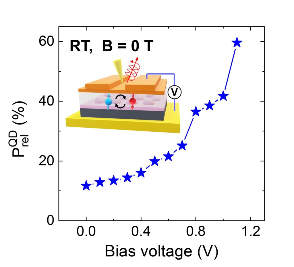 我々は最近、海外グループとの共同研究により、室温では容易に失われる半導体中の電子スピン情報(スピン偏極)を、室温からさらには摂氏110℃にわたって効率的に増幅し復元することが可能な、新しい量子ドット材料を実現しました。また、このようなスピン増幅型の量子ドットを利用するスピンLEDも提案しています。