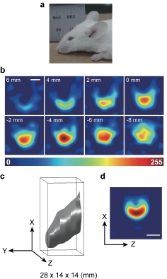 連続波EPRイメージングで、初めて3次元イメージングを経由せずに直接取得した動物のスライス画像(b)と、それを重ね合わせて作った三次元画像(c). (H. Sato-Akaba et al., Magn. Reson. Med. 2008:59;885-890)